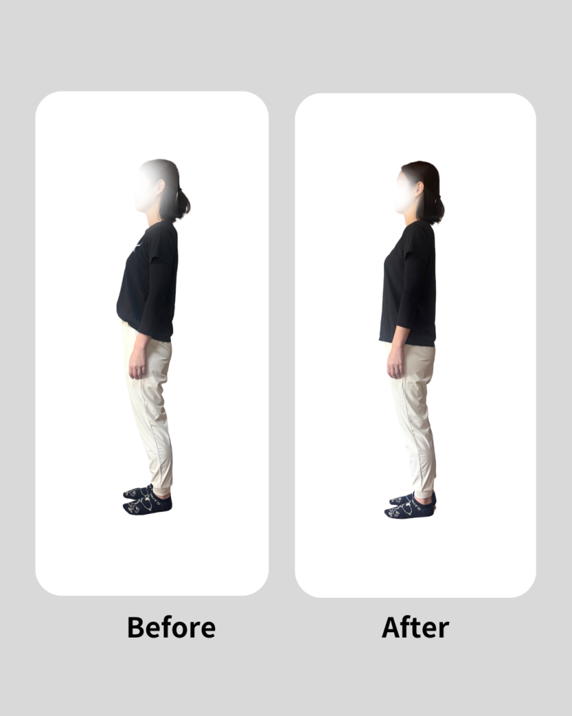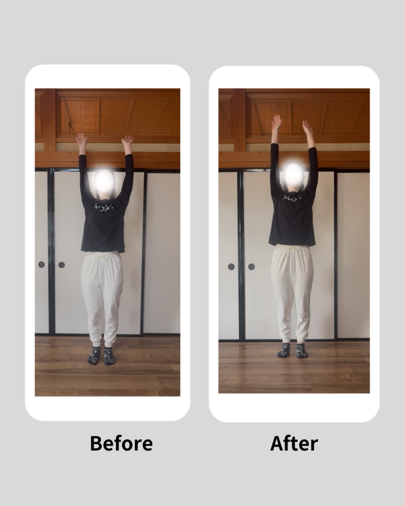 今回のお客様は、左肩に不調があり、両腕を上げると左肩が外側に開き、真っ直ぐに上がらない状態でした。パーソナルレッスンでは、肩周りのコンディショニングから肩甲骨の動きを改善するストレッチ要素のあるエクササイズと、肩甲骨を安定させるよう体幹にアプローチするエクササイズを組み合わせて実施しました。その結果、腕を上げた際の肩の開きが改善し、「腕が楽になった」とのお声をいただきました。ピラティスでは、肩甲骨周りの柔軟性向上や筋バランスの調整、体幹の安定性強化を通じて、肩の動きの改善や姿勢改善に効果的です。両腕を上げると左肩が外に開きながら上がっており耳と腕の距離が右側と比較し距離があります。